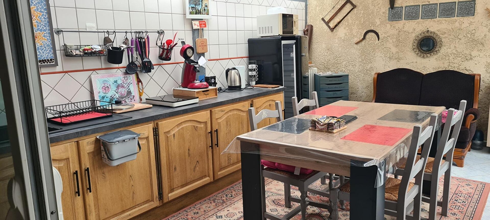 Composition : Chambre totalement indépendante (accès) au rdc d’une aile de la maison. Wifi (fibre). Chauffage PAC. Climatisation. TV dans la chambre. Chambre (lit 2 p. 160x200cm) avec salle d’eau privative (douche/Wc) + pièce de vie privative attenante accessible par extérieur (espace repas & détente + cuisine complète avec micro-ondes, four, réfrigérateur et plaques électriques). Terrasse + jardinet clos + parking privés. Local vélos. Toutes commodités dont restaurants 6.5 km. Supermarché 5.5 km.