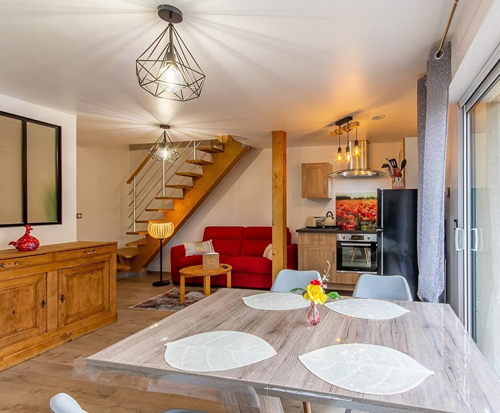 Composition du gîte : Maison individuelle sur 2 niveaux (duplex) jouxtant la maison des propriétaires (indépendance totale sans vis-à-vis). Wifi. Chauffage par Pompe à Chaleur. Climatisation. Rdc : séjour-cuisine-salon (canapé convertible 2 p. 140x190cm en appoint), salle d'eau (douche), wc indépendant. 1er étage : 2 chambres (lit 2 p. 160x200cm / 2 lits 1 p. 90x200cm). Jardinet clos + terrasse + parking privés. Local vélos disponible côté jardin des propriétaires. Commerces et services 6 km. Golf 18 km. Gare 15 km. Gare TGV du Creusot 48 km. Surface au sol : 60m² (incluant les superficies en mansardes sous une hauteur de 1.80m).