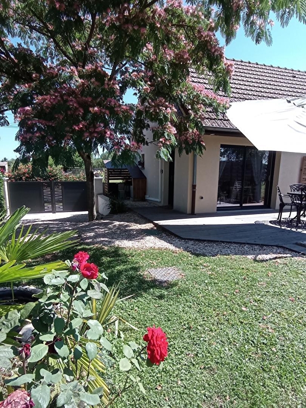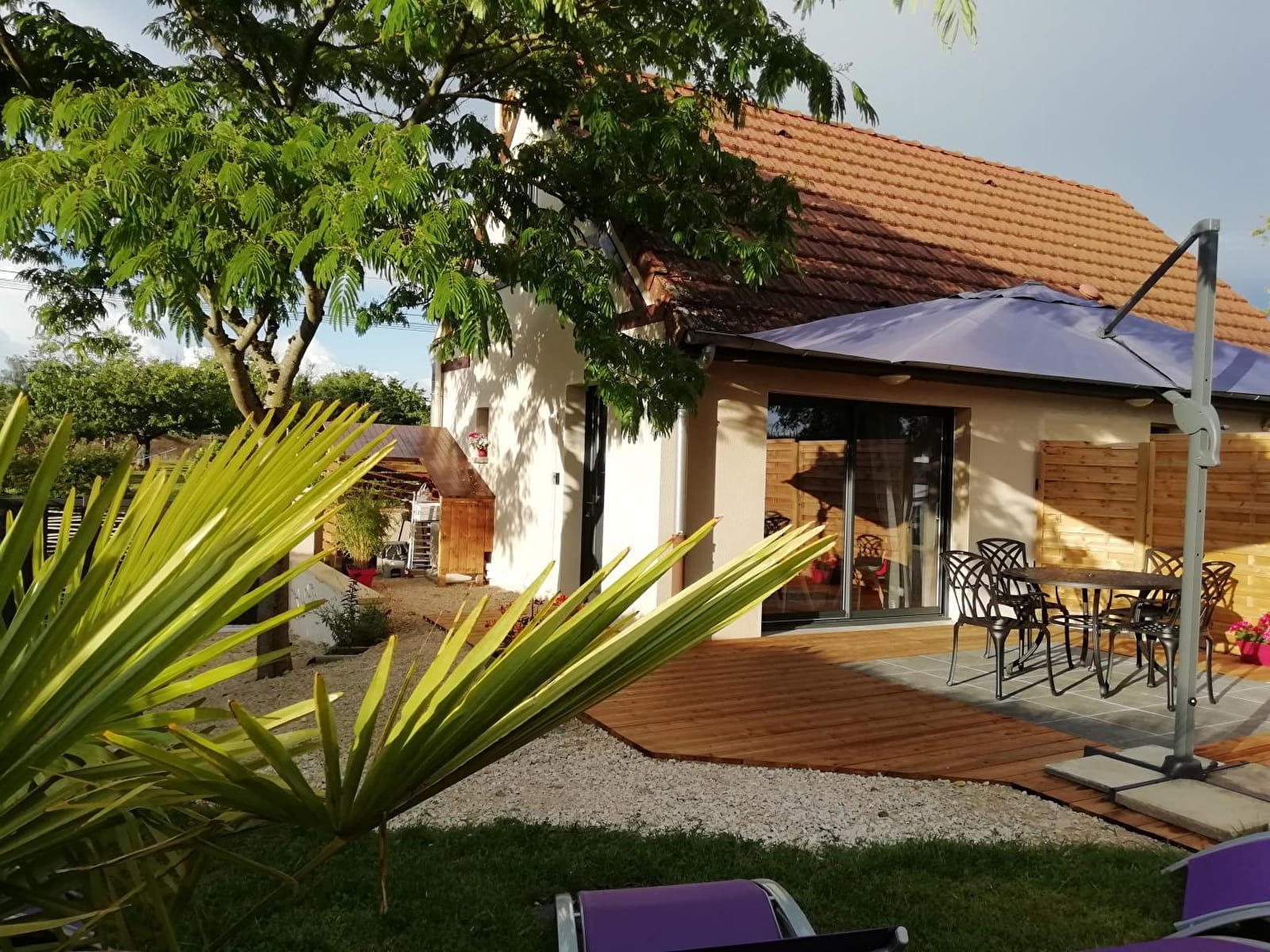 Ravissante maison contemporaine de caractère, aménagée dans un esprit de « cottage » typique à colombage - dans le respect de l'architecture bressane locale - sise au cœur d'un petit village résidentiel longeant la voie verte (connectée à l'EuroVélo6) & la Saône (véritable paradis des kayakistes & pêcheurs, réputé pour ses célèbres silures, sandres, carpes…). En pleine campagne, au sein d'un cadre champêtre et rural préservé, en lisière de champs, rivières et prairies, proche de vastes forêts domaniales (dont le Bois de Bissy à deux pas), au creux d'un site naturel protégé classé "Zone Natura 2000" pour son remarquable écosystème (dont une exceptionnelle réserve ornithologique riche de 160 espèces et de nombreuses variétés végétales rares). Gîte de très bon confort doté d'un chaleureux cachet campagnard contemporain aux inspirations nordiques. Ambiance zen et douce. Beaucoup de charme. Coquettes chambres reposantes lovées sous les toits mariant l'esprit de « cabanes » douillettes à l'atmosphère dépaysante des anciennes demeures de pays. Équipement complet de qualité. Cocooning & cosy. Charmant petit jardinet clos intimiste (niché à l'abri des regards), soigneusement végétalisé et très fleuri, abritant un petit bassin (sans danger) et une large terrasse toute à la fois exposée et ombragée sous un albizia (ayant donné son nom au gîte…).