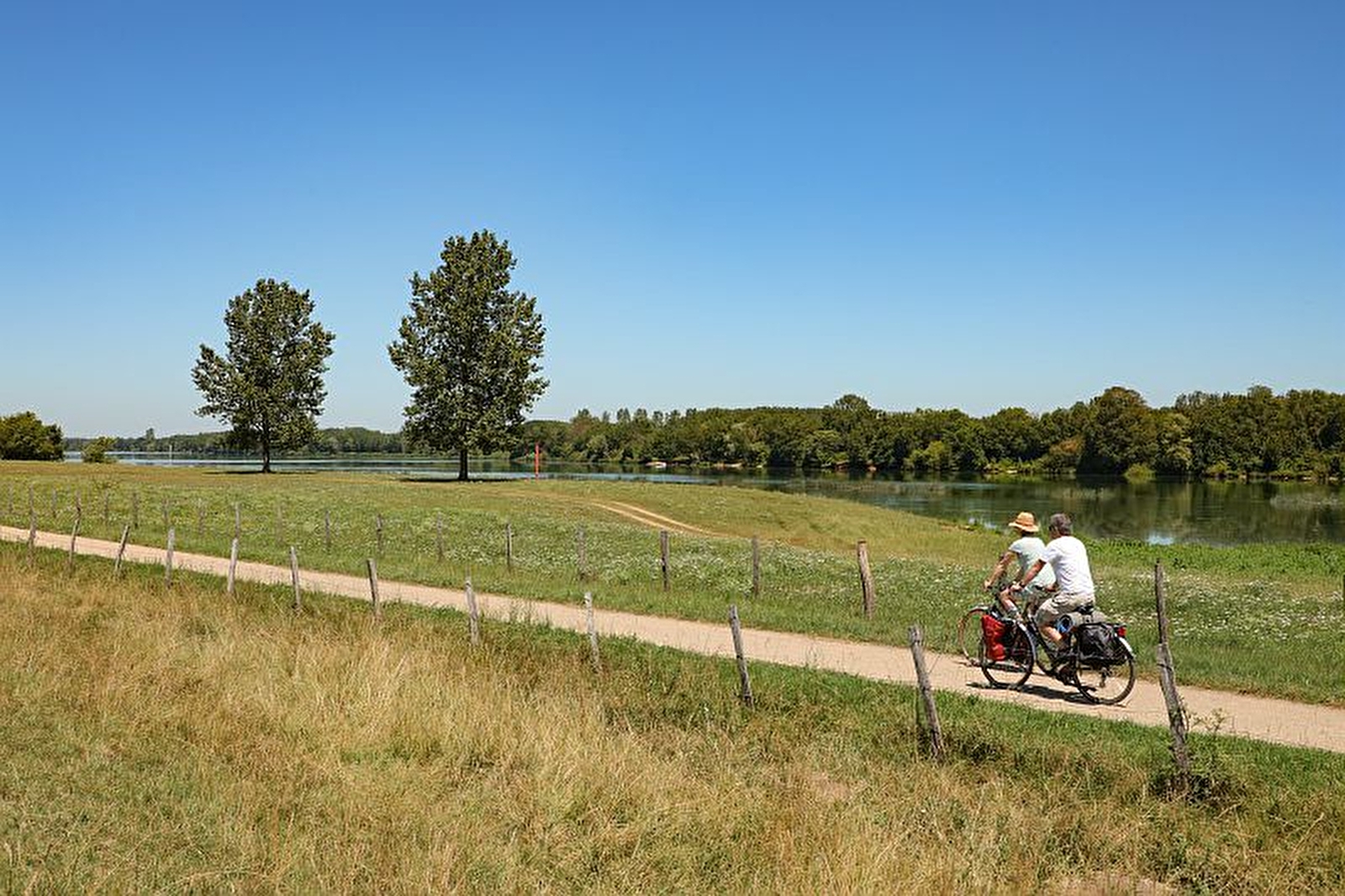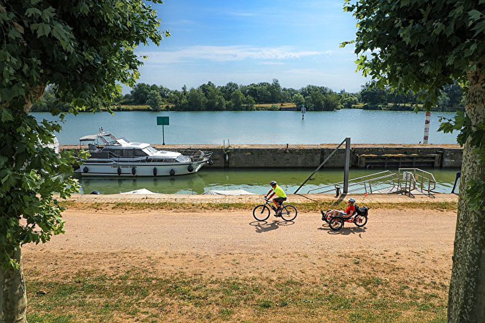 Cet itinéraire relie la ville de Apach au Luxembourg à Lyon (sur la viaRhôna), sur une distance d’environ 700 km en suivant les vallées de la Moselle et de la Saône. Le parcours de 106 km en Saône-et-Loire (de Mont-les-Seurre à Mâcon) longe les chemins de halage de la Voie Bleue le long de la Saône. Pratiquez le vélo-douceur sur un circuit semé d’étapes gourmandes et culturelles. Les rives de la Saône diffusent une quiétude bienfaisante et les chemins de halage, à de rares exceptions, ignorent les dénivelés. La Voie Verte prend ici la couleur bleue des reflets du ciel dans la rivière. Le nez au vent hume des bouffées de campagne - prairies, champs de céréales - mêlée des parfums caractéristiques des milieux humides, si prompts à dépayser. Le pédalier peu sollicité, l’esprit vogue en toute liberté au-dessus du cours nonchalant de la rivière où les péniches et les bateaux de plaisance tracent leurs sillons éphémères. Lors des haltes rafraîchissantes au bord de l’eau, la nature semble vivre au ralenti. Sur le parcours, découvrez avec un guide le Mâcon insolite ; promenez-vous dans les ruelles de Tournus, visitez la sublime abbaye, régalez-vous à une table gastronomique ; flânez sur le port et dans la vieille ville de Verdun-sur-le-Doubs. ATTENTION : le revêtement en bicouche ou sablé (excepté aux entrées d'agglomérations où la voie est en enrobé) ne permet pas la pratique du roller. Info + : de Mont-les-Seurre à Chalon-sur-Saône sur 33 km, le circuit emprunte une étape de l'EuroVelo 6, et de Chalon à Mâcon sur 68 km un tronçon du Tour de Bourgogne à Vélo. Le bon plan : téléchargez l'application Voie Verte 71 et laissez-vous guider ! Vous recevez une alerte dès que vous êtes proche d'un point d'intérêt touristique. Découvrez La Voie Bleue entre Chalon-sur-Saône et Mâcon en 21 points !